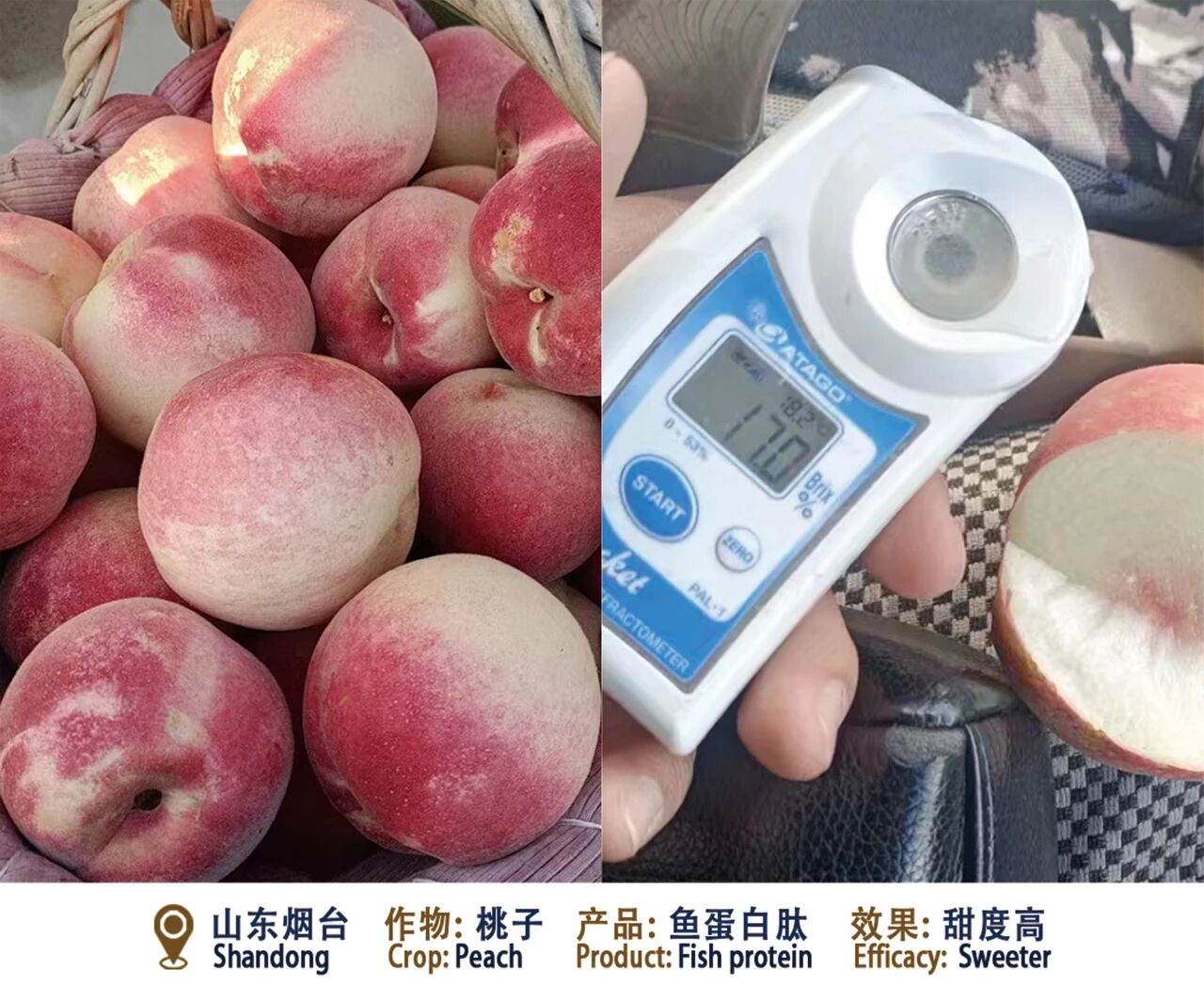 喷施鱼蛋白肽后,桃子糖度明显提升,口感更香甜,卖价也高了! · 糖度增加1-2度,果肉细腻;